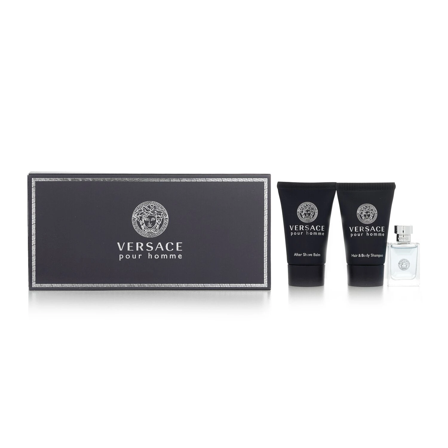 Versace Pour Homme Set (Not For Sale): 1x Pour Homme Eau De Toilette 5ml/0.17oz 1x Pour Homme Hair & Body Shampoo 25ml/0.8oz 1x Pour Homme After Shave Balm 25ml/0.8oz